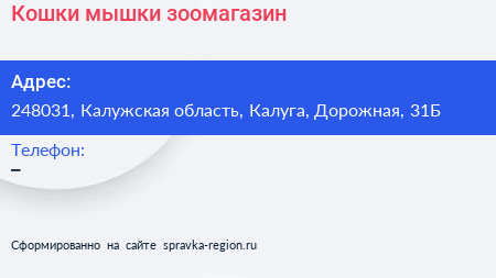 Кошки & мышки, зоомагазин по адресу 248031, Калужская область, Калуга, Дорожная, 31Б в дальнейшем Организация, размещена в следующих категориях: