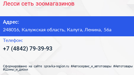 Лесси, сеть зоомагазинов по адресу 248016, Калужская область, Калуга, Ленина, 56а в дальнейшем Организация, размещена в следующих категориях: