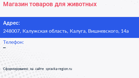 Магазин товаров для животных по адресу 248007, Калужская область, Калуга, Вишневского, 14а в дальнейшем Организация, размещена в следующих категориях:
