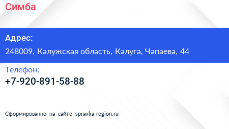 Симба по адресу 248009, Калужская область, Калуга, Чапаева, 44 в дальнейшем Организация, размещена в следующих категориях: