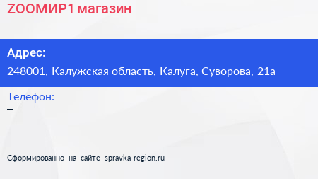 ZOOМИР1, магазин по адресу 248001, Калужская область, Калуга, Суворова, 21а в дальнейшем Организация, размещена в следующих категориях: