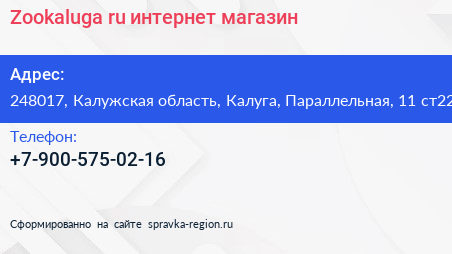 Zookaluga.ru, интернет-магазин по адресу 248017, Калужская область, Калуга, Параллельная, 11 ст22 в дальнейшем Организация, размещена в следующих категориях:
