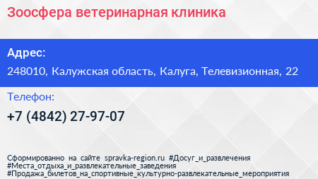 Зоосфера, ветеринарная клиника по адресу 248010, Калужская область, Калуга, Телевизионная, 22 в дальнейшем Организация, размещена в следующих категориях: