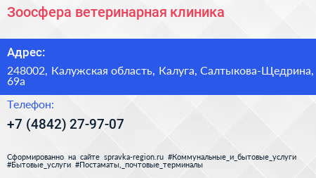 Зоосфера, ветеринарная клиника по адресу 248002, Калужская область, Калуга, Салтыкова-Щедрина, 69а в дальнейшем Организация, размещена в следующих категориях: