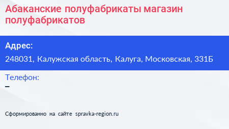 Абаканские полуфабрикаты, магазин полуфабрикатов по адресу 248031, Калужская область, Калуга, Московская, 331Б в дальнейшем Организация, размещена в следующих категориях: