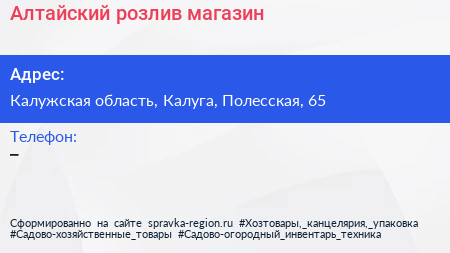 Алтайский розлив, магазин по адресу Калужская область, Калуга, Полесская, 65 в дальнейшем Организация, размещена в следующих категориях: