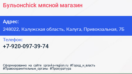 Бульонchick, мясной магазин по адресу 248022, Калужская область, Калуга, Привокзальная, 7Б в дальнейшем Организация, размещена в следующих категориях:
