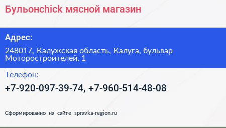 Бульонchick, мясной магазин по адресу 248017, Калужская область, Калуга, бульвар Моторостроителей, 1 в дальнейшем Организация, размещена в следующих категориях:
