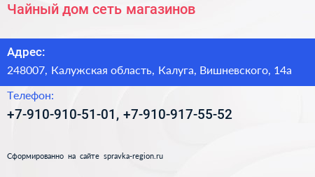 Чайный дом, сеть магазинов по адресу 248007, Калужская область, Калуга, Вишневского, 14а в дальнейшем Организация, размещена в следующих категориях: