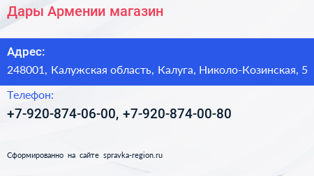 Дары Армении, магазин по адресу 248001, Калужская область, Калуга, Николо-Козинская, 5 в дальнейшем Организация, размещена в следующих категориях: