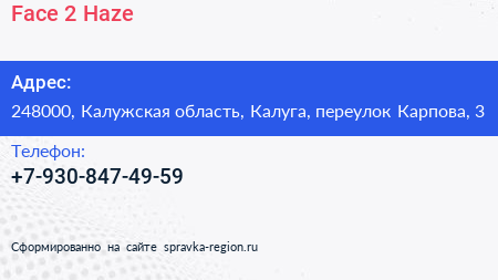 Face 2 Haze по адресу 248000, Калужская область, Калуга, переулок Карпова, 3 в дальнейшем Организация, размещена в следующих категориях: