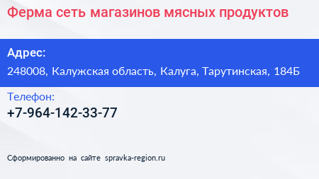 Ферма, сеть магазинов мясных продуктов по адресу 248008, Калужская область, Калуга, Тарутинская, 184Б в дальнейшем Организация, размещена в следующих категориях: