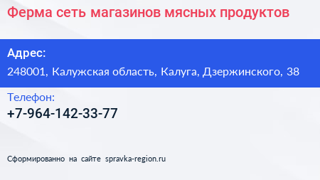 Ферма, сеть магазинов мясных продуктов по адресу 248001, Калужская область, Калуга, Дзержинского, 38 в дальнейшем Организация, размещена в следующих категориях: