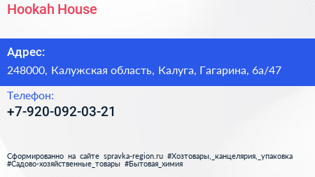 Hookah House по адресу 248000, Калужская область, Калуга, Гагарина, 6а/47 в дальнейшем Организация, размещена в следующих категориях: