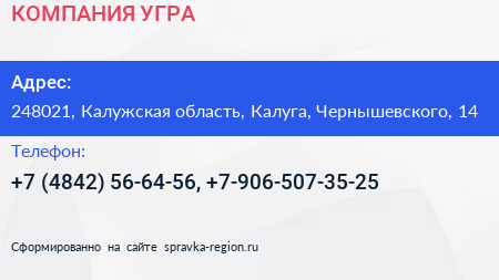 КОМПАНИЯ УГРА по адресу 248021, Калужская область, Калуга, Чернышевского, 14 в дальнейшем Организация, размещена в следующих категориях: