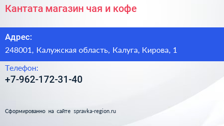 Кантата, магазин чая и кофе по адресу 248001, Калужская область, Калуга, Кирова, 1 в дальнейшем Организация, размещена в следующих категориях: