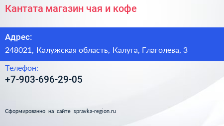 Кантата, магазин чая и кофе по адресу 248021, Калужская область, Калуга, Глаголева, 3 в дальнейшем Организация, размещена в следующих категориях:
