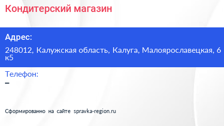 Кондитерский магазин по адресу 248012, Калужская область, Калуга, Малоярославецкая, 6 к5 в дальнейшем Организация, размещена в следующих категориях: