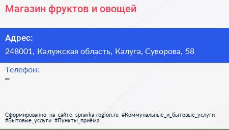 Магазин фруктов и овощей по адресу 248001, Калужская область, Калуга, Суворова, 58 в дальнейшем Организация, размещена в следующих категориях: