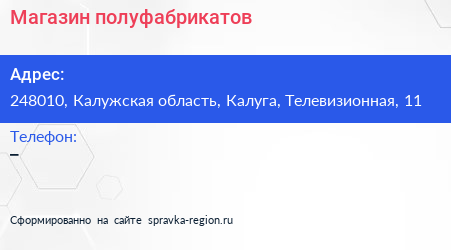 Магазин полуфабрикатов по адресу 248010, Калужская область, Калуга, Телевизионная, 11 в дальнейшем Организация, размещена в следующих категориях: