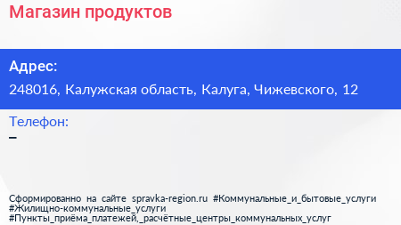 Магазин продуктов по адресу 248016, Калужская область, Калуга, Чижевского, 12 в дальнейшем Организация, размещена в следующих категориях: