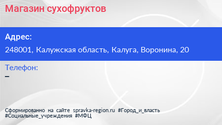 Магазин сухофруктов по адресу 248001, Калужская область, Калуга, Воронина, 20 в дальнейшем Организация, размещена в следующих категориях: