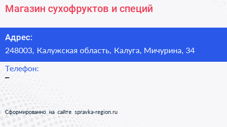 Магазин сухофруктов и специй по адресу 248003, Калужская область, Калуга, Мичурина, 34 в дальнейшем Организация, размещена в следующих категориях: