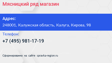 Мясницкий ряд, магазин по адресу 248001, Калужская область, Калуга, Кирова, 98 в дальнейшем Организация, размещена в следующих категориях: