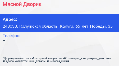 Мясной Дворик по адресу 248033, Калужская область, Калуга, 65 лет Победы, 35 в дальнейшем Организация, размещена в следующих категориях:
