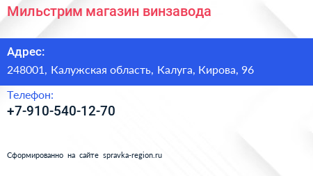 Мильстрим, магазин винзавода по адресу 248001, Калужская область, Калуга, Кирова, 96 в дальнейшем Организация, размещена в следующих категориях: