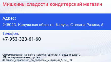 Мишкины сладости, кондитерский магазин по адресу 248023, Калужская область, Калуга, Степана Разина, 6 в дальнейшем Организация, размещена в следующих категориях: