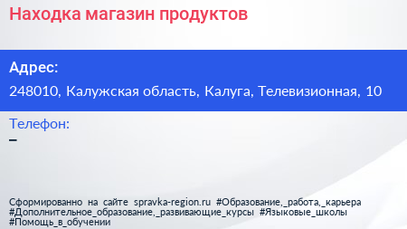 Находка, магазин продуктов по адресу 248010, Калужская область, Калуга, Телевизионная, 10 в дальнейшем Организация, размещена в следующих категориях: