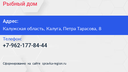 Рыбный дом по адресу Калужская область, Калуга, Петра Тарасова, 8 в дальнейшем Организация, размещена в следующих категориях: