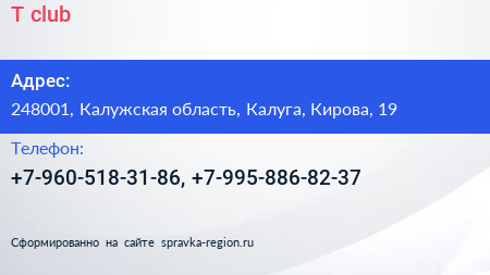 T-club по адресу 248001, Калужская область, Калуга, Кирова, 19 в дальнейшем Организация, размещена в следующих категориях: