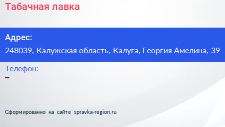 Табачная лавка по адресу 248039, Калужская область, Калуга, Георгия Амелина, 39 в дальнейшем Организация, размещена в следующих категориях: