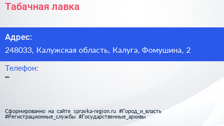 Табачная лавка по адресу 248033, Калужская область, Калуга, Фомушина, 2 в дальнейшем Организация, размещена в следующих категориях: