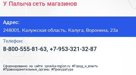 У Палыча, сеть магазинов по адресу 248001, Калужская область, Калуга, Воронина, 23а в дальнейшем Организация, размещена в следующих категориях: