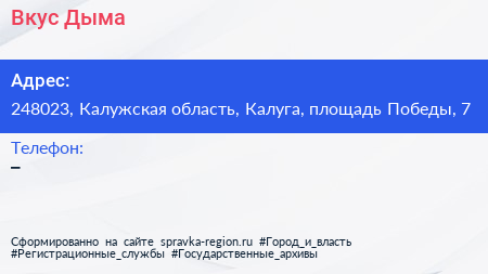 Вкус Дыма по адресу 248023, Калужская область, Калуга, площадь Победы, 7 в дальнейшем Организация, размещена в следующих категориях: