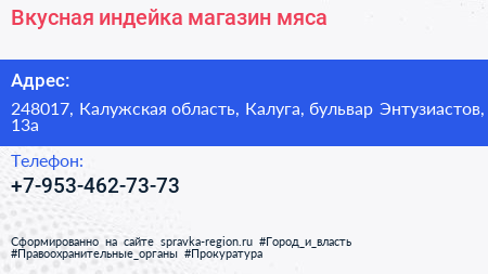 Вкусная индейка, магазин мяса по адресу 248017, Калужская область, Калуга, бульвар Энтузиастов, 13а в дальнейшем Организация, размещена в следующих категориях: