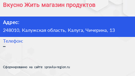 Вкусно Жить, магазин продуктов по адресу 248010, Калужская область, Калуга, Чичерина, 13 в дальнейшем Организация, размещена в следующих категориях: