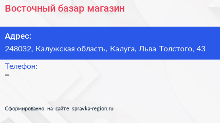 Восточный базар, магазин по адресу 248032, Калужская область, Калуга, Льва Толстого, 43 в дальнейшем Организация, размещена в следующих категориях:
