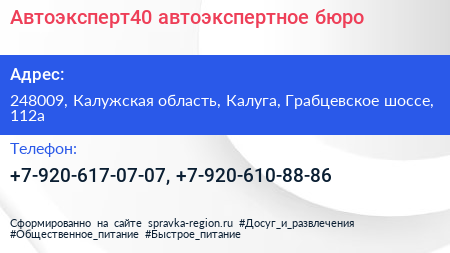Автоэксперт40, автоэкспертное бюро по адресу 248009, Калужская область, Калуга, Грабцевское шоссе, 112а в дальнейшем Организация, размещена в следующих категориях: