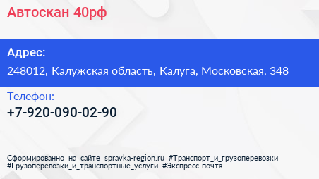 Автоскан-40рф по адресу 248012, Калужская область, Калуга, Московская, 348 в дальнейшем Организация, размещена в следующих категориях:
