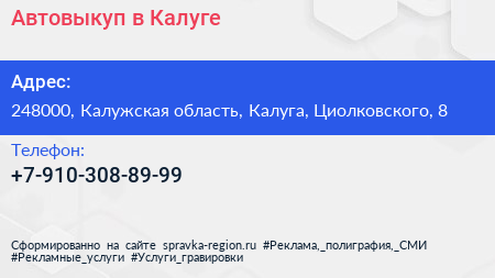 Автовыкуп в Калуге по адресу 248000, Калужская область, Калуга, Циолковского, 8 в дальнейшем Организация, размещена в следующих категориях: