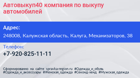 Автовыкуп40, компания по выкупу автомобилей по адресу 248008, Калужская область, Калуга, Механизаторов, 38 в дальнейшем Организация, размещена в следующих категориях: