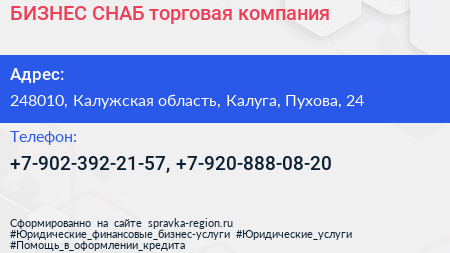 БИЗНЕС СНАБ, торговая компания по адресу 248010, Калужская область, Калуга, Пухова, 24 в дальнейшем Организация, размещена в следующих категориях: