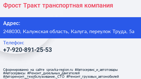 Фрост Тракт, транспортная компания по адресу 248030, Калужская область, Калуга, переулок Труда, 5а в дальнейшем Организация, размещена в следующих категориях: