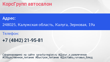 КорсГрупп, автосалон по адресу 248025, Калужская область, Калуга, Зерновая, 19а в дальнейшем Организация, размещена в следующих категориях: