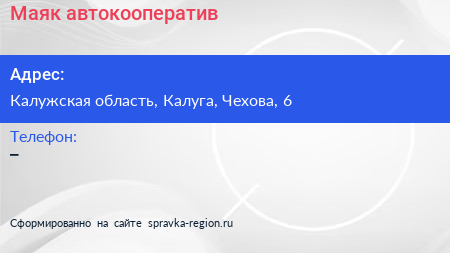 Маяк, автокооператив по адресу Калужская область, Калуга, Чехова, 6 в дальнейшем Организация, размещена в следующих категориях: