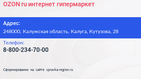 OZON.ru, интернет-гипермаркет по адресу 248000, Калужская область, Калуга, Кутузова, 28 в дальнейшем Организация, размещена в следующих категориях: